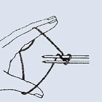 Для тренировки можно взять нити двух цветов; при правильном наборе на нижней и верхней спицах получаются петли разного цвета.
