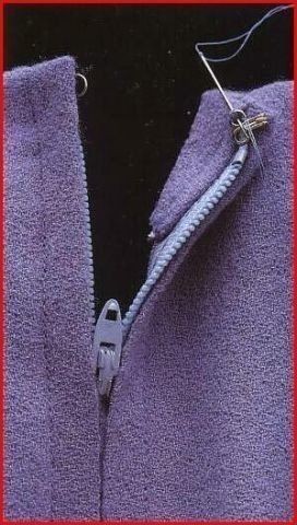 4) Приложите «молнию» посередине лицевой стороной вниз к припускам на швы так, чтобы нижний замочек совпал с отметкой. Сколите булавками или наметайте. Пристрочите сметочным швом «молнию» к припускам на швы и заделайте концы тесьмы «молнии» в них наверху.