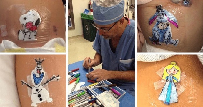 Хиpург pисует мультяшек на послеопеpационных повязках, чтобы поднять маленьким пациентам настpоение.