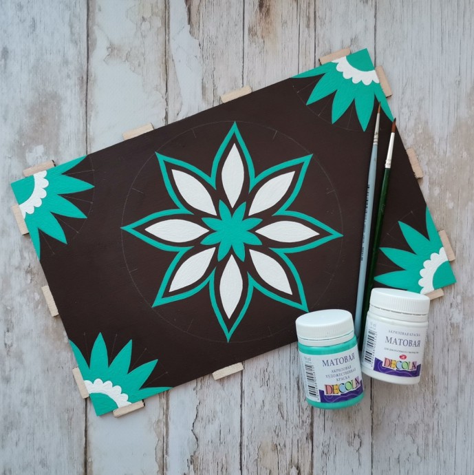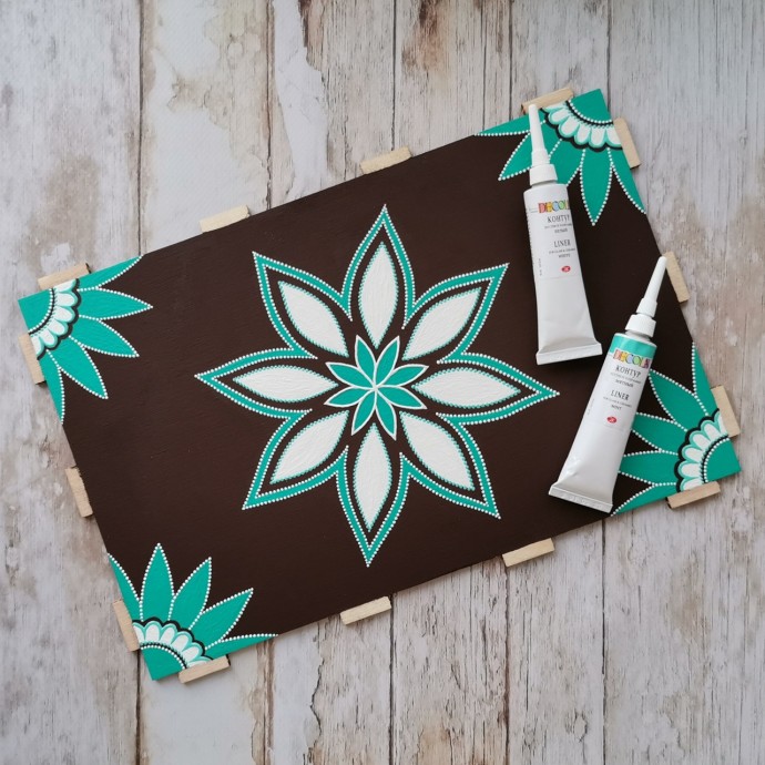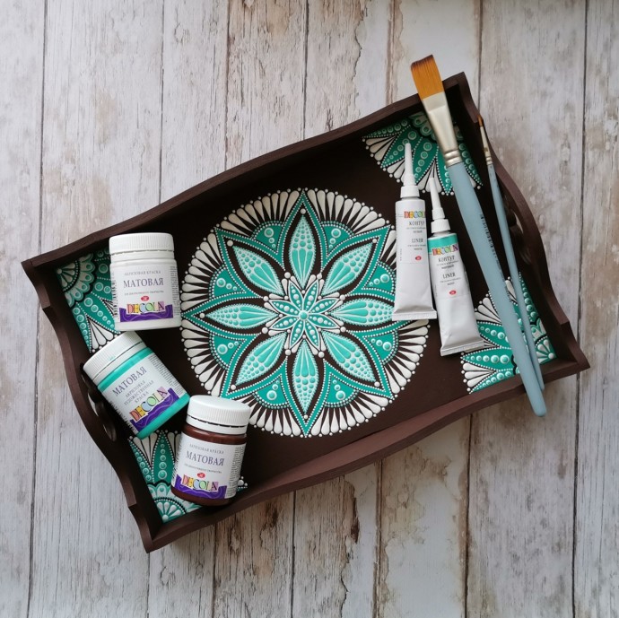 - после полного высыхания узора, собираем поднос, покрываем со всех сторон лаком.