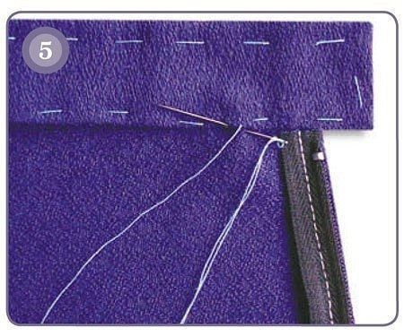 5. Выньте наметку по линии пристрочки. Загладьте припуск на сторону обтачки. Подогнутым краем пояса накройте кроите шов, приметайте и по-тайными стежками вручную пришейте пояс к юбке. Ста-райтесь не делать сквозных проколов — строчка не должна быть видна на лиц. стороне.