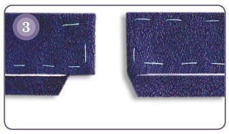 2. Сложите пояс по центральной линии сгиба, сколите. Застрочите на одном конце пояса торец до линии подгибки. На другом конце прострочите торец, разверните ткань, подняв лапку и не вынимая иглы, и вновь прострочите заход края. Обрежьте уголки, как показано на фото. Прогладьте швы.