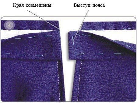 4. Приколите края пояса на лиц. сторону верхней частью, распределите равномерно юбку по поясу, выровняв верхние края. Совместите прямой край пояса с краем застежки юбки. Выступ должен совместиться с краем застежки началом строчки. Приметайте и прострочите на машине.