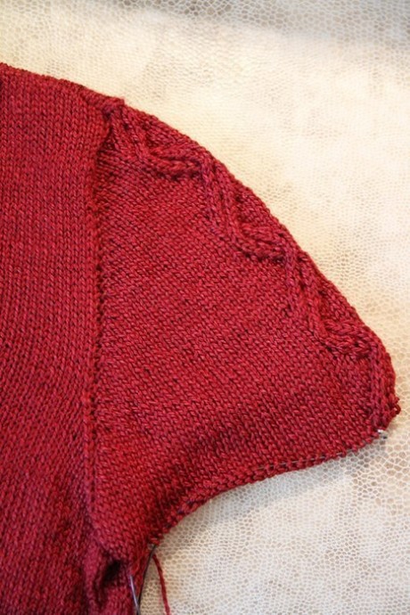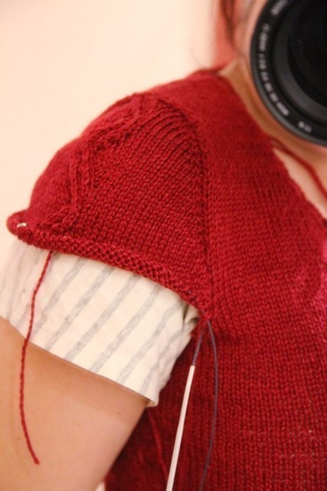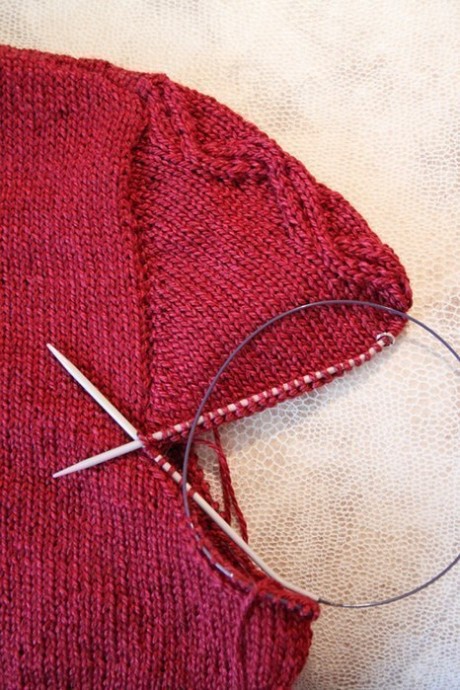 Набираем петли вокруг всей проймы, начинаем от «бокового шва», идем вверх по переду, до плеча, затем дальше по спинке, вниз, опять до «бокового шва».