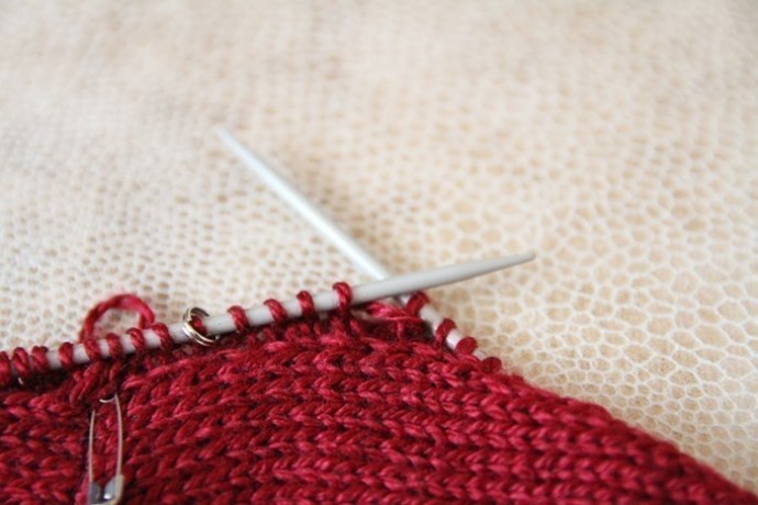 Отмечаем центральную петлю, ту что у плечевого шва. (У меня вы увидите еще 2 маркера, это потому что по центру рукава шел узор в 9 петель, маркеры для него, но по ним вы сможете легко ориентироваться, как прибавлялись мои ряды.)