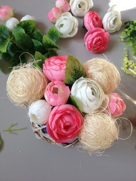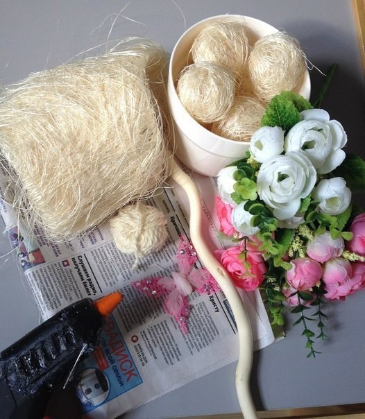Топиарий с розами и лыком пленяет свежестью своего решения.
