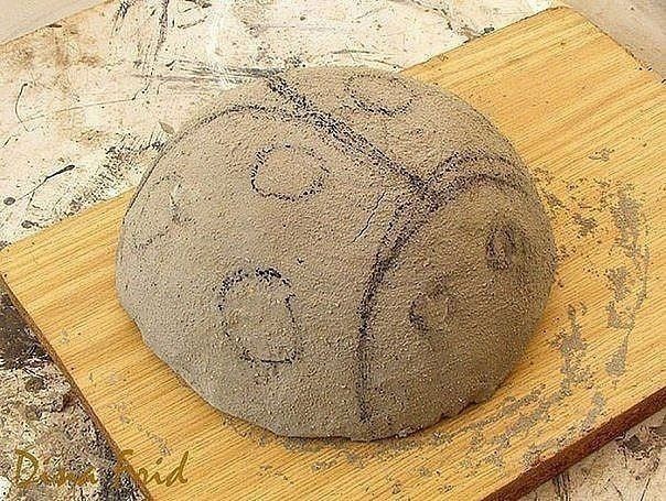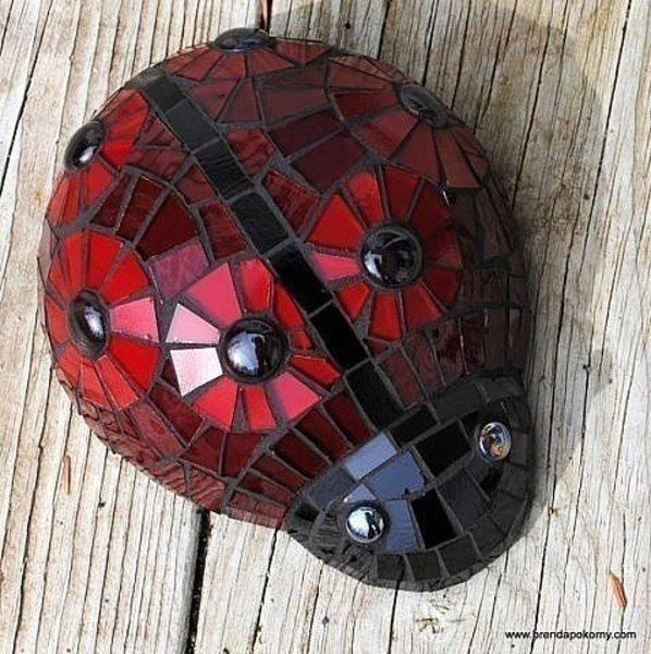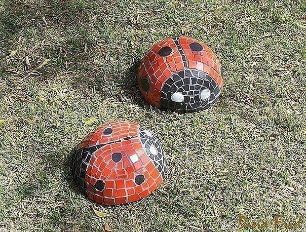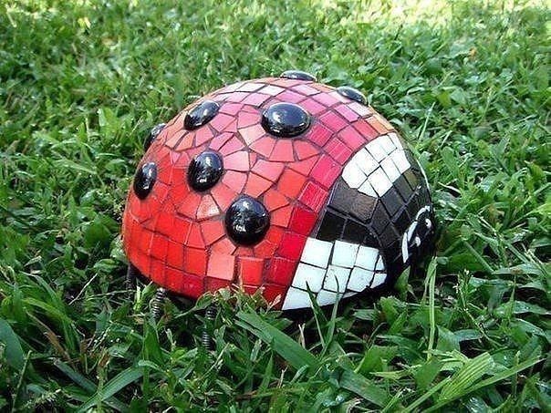 Божья коровка для сада создается из мозаики на основе цемента.