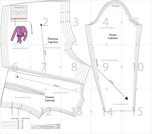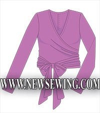Сегодняшняя наша тема – блузки. Готовая выкройка блузки с запахом и длинным поясом, завязывающимся на талии. По этой выкройке можно сшить блузку как из шелка, так и из трикотажа. Рукава кроятся по косой в том случае, если вы остановите свой выбор на шелке (шифоне) или на любой другой не эластичной ткани. Если же ткань обладает высокой эластичностью, рукава можно кроить не по косой и выточки на спинке можно не делать.