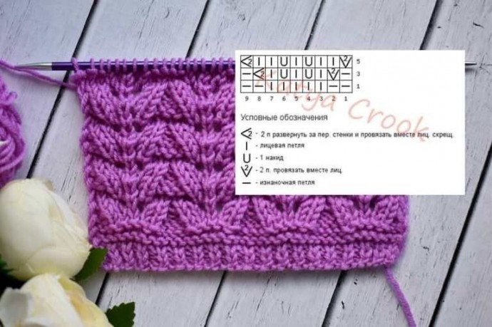 2-й, 4-й и 6-й ряды: по рисунку, при этом накиды предыдущих рядов вязать изнаночными петлями.