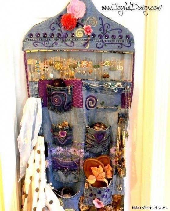 Джинсовый органайзер на вешалке поможет собрать все мелкие вещи в одном месте.