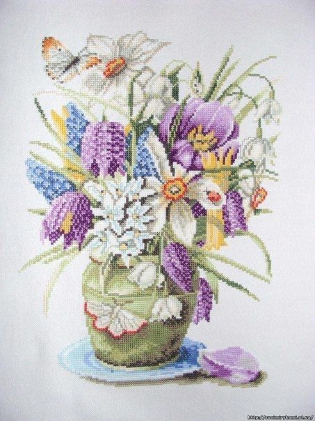 Вышивание прекрасной цветочной картины может подарить только море счастья, настолько нежно и красиво подобраны сочные оттенки самых весенних цветов.