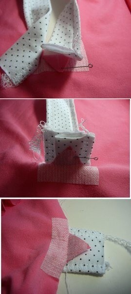 Верхний край планок (при условии, что ткань жутко тянучая) дублируем сантиметровой полоской флизелина, порванного по долевой (фото планки от другой футболки). На этой укрепление делать не стала