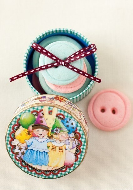 Привет! Я ко дню рождения дочери искала интересные блюда и встретила такое печенье. Изготовление: вырезать кружки стаканчиком, затем сделать ободок - продавить не до конца рюмкой или формой (меньшего диаметра), дырочки сделать трубочкой от коктейля. Для цвета добавить пищевые красители. А вообще-то и декоративные из полимерной глины или из соленого теста были бы интересны.