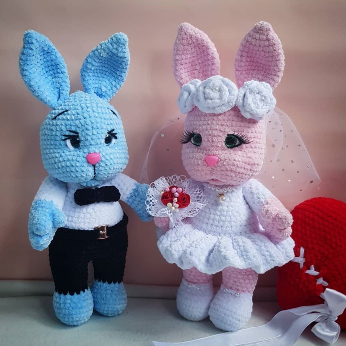 Такие зайки могут либо украсить стол молодых, либо быть подарены как символ их любви и игрушка их будущего ребенка.
