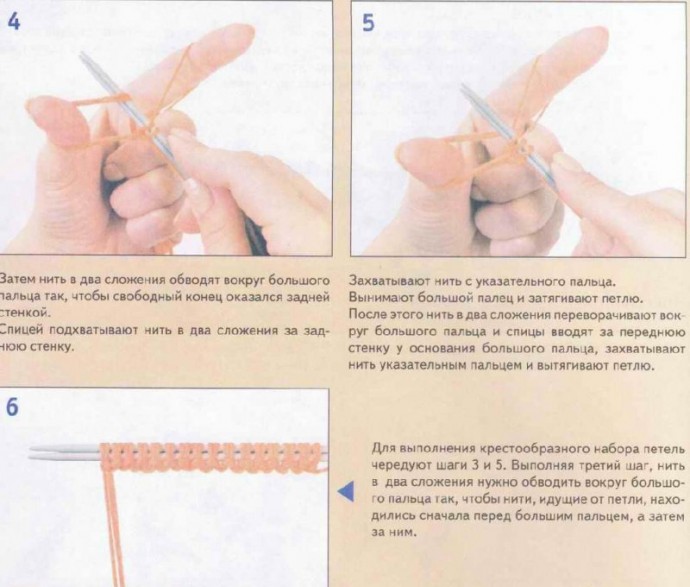 Переносим двойную нить набора с внешней стороны большого пальца на внутреннюю, набираем 1 петлю.