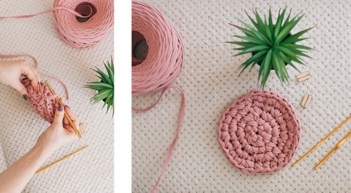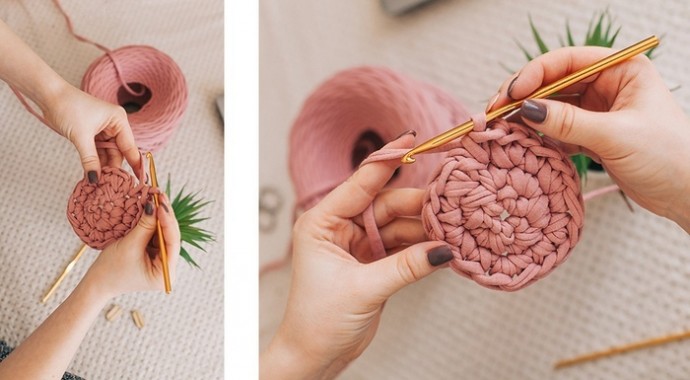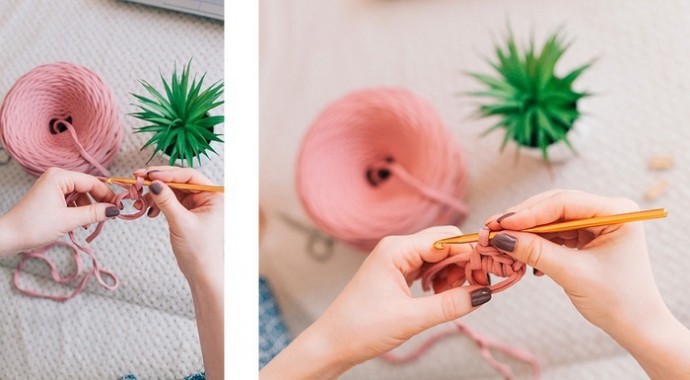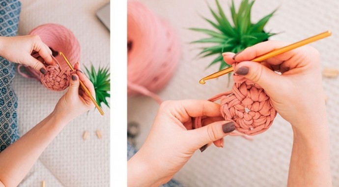 Чем толще пряжа, тем быстрее вяжется корзинка и тем плотнее ее стенки.