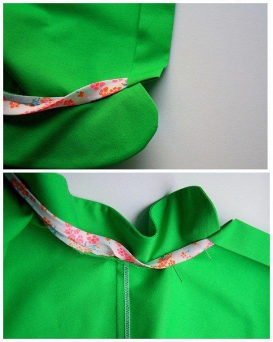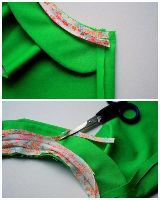 Обработка воротника косой бейкой это вариант придать дорогой вид и спрятать швы красиво.