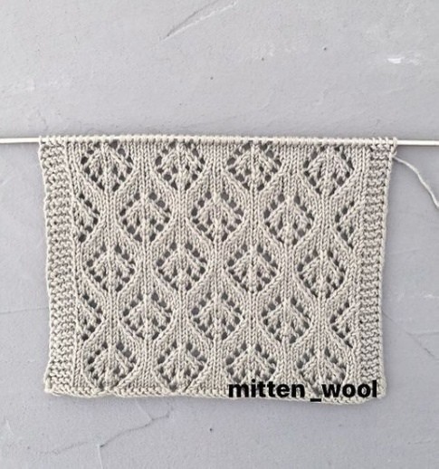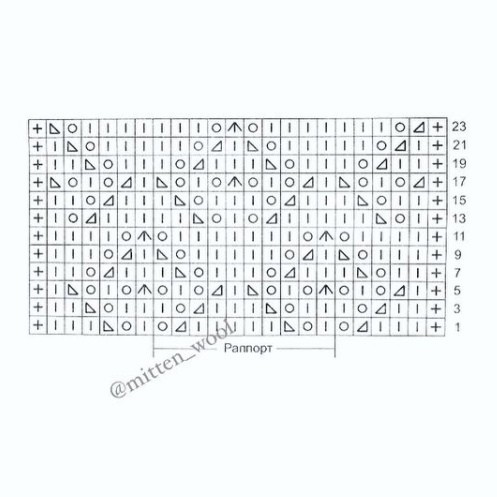 Начинаем вязать с 1-й кром.п. и петель перед раппортом, повторяем петли раппорта, закончить петлями после раппорта и 1 кром. п.