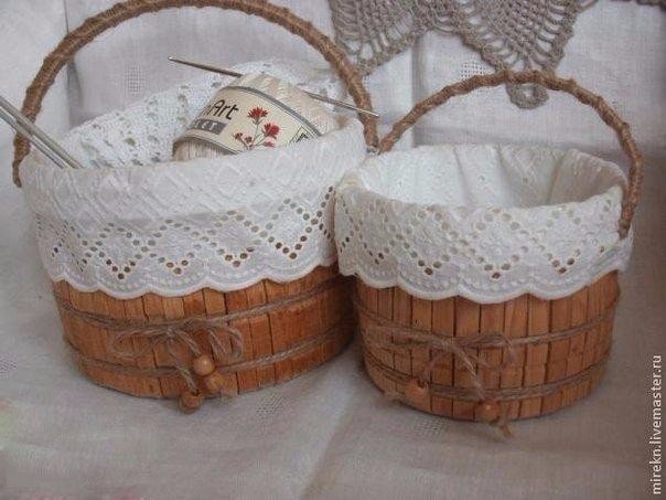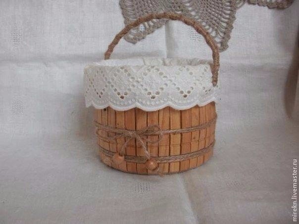 Преображение старой пластиковой банки происходит при помощи деревянных прищепок.