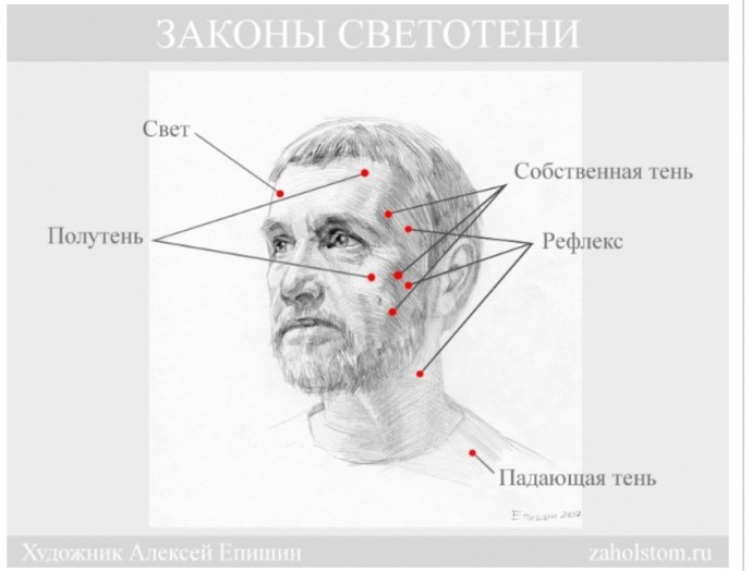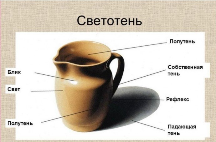На поверхности каждого освещенного предмета есть: свет с бликом, полутон, тень, рефлекс (участки, освещенные отраженным светом)