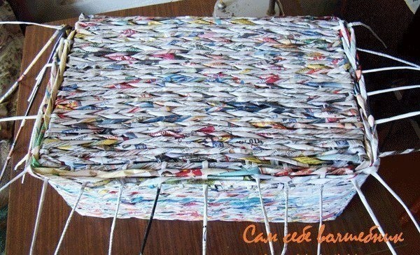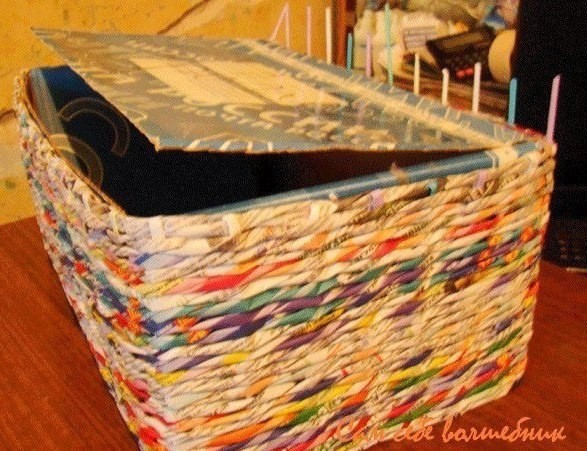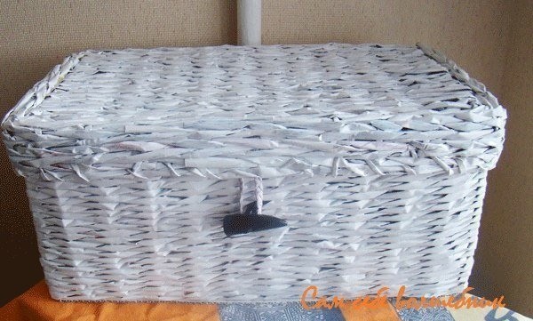 Сундучок, который сплетен при помощи газетных трубочек, очень удобен для организации порядка в доме.