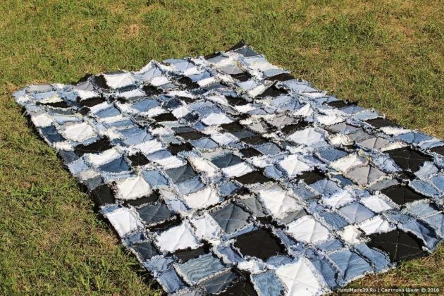 Теплое джинсовое покрывало в технике пэчворк можно брать с собой на природу как подстилку.