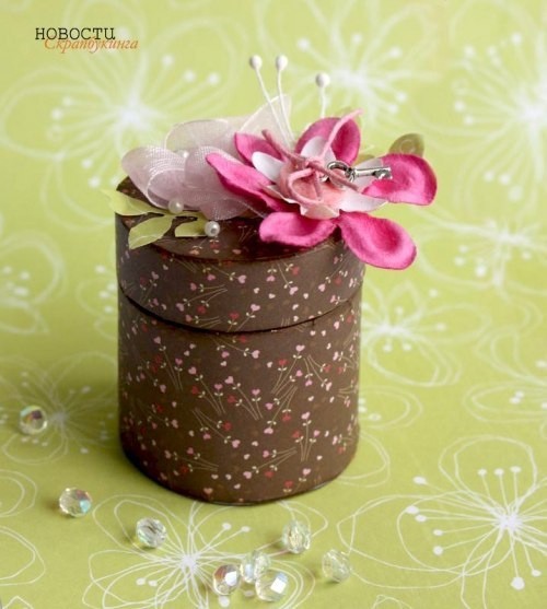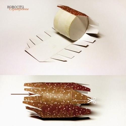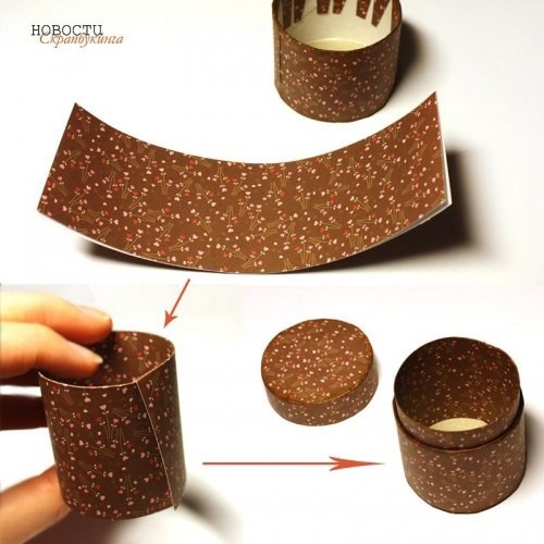 8. Далее отрезам полоску скрап бумаги (ее длинна на 1 см больше окружности основы, ширина 10 см) и складываем ее пополам. Скручиваем полоску трубкой и прячем один край в другой. Наносим клей на внутренние стенки основы, вставляем трубочку из скрап бумаги и приклеиваем ее к основе. Этот прием позволит крышке надежно держаться на основе.