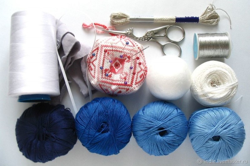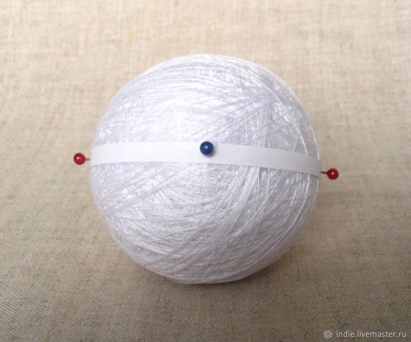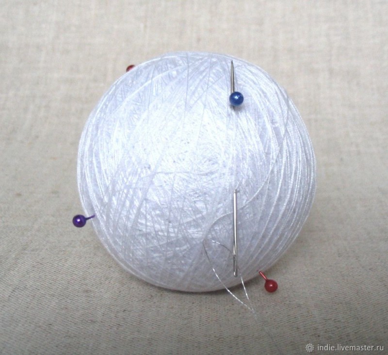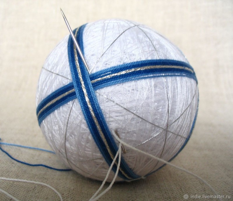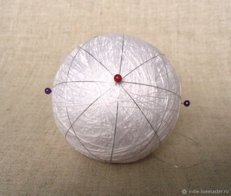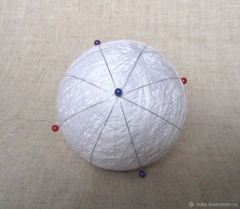 Для разметки можно выбрать один из цветов основного узора, а можно сделать ее незаметной, взяв близкие к цвету фона нитки. Я использовала тонкую металлизированную нить. Втыкаем иглу с ниткой на расстоянии примерно 1,5 — 2 см от плюса и выводим строго на полюсе. Узелок должен спрятаться в толще шара.