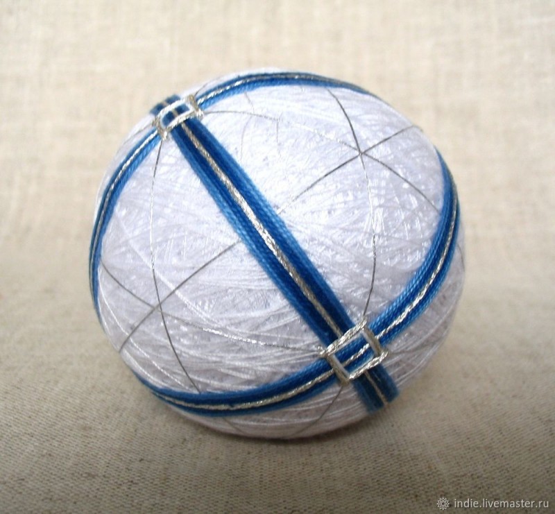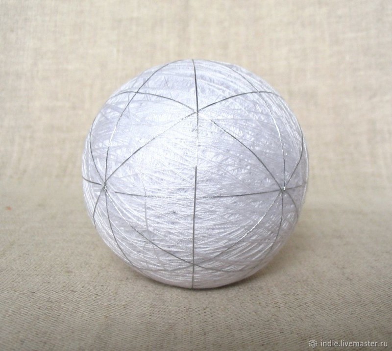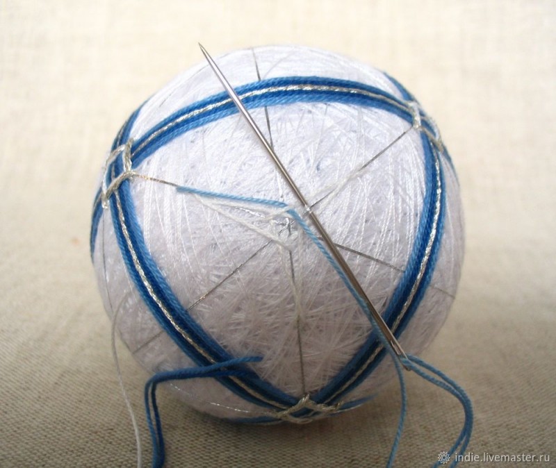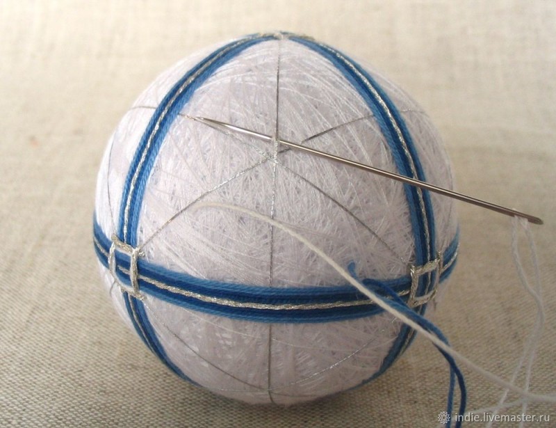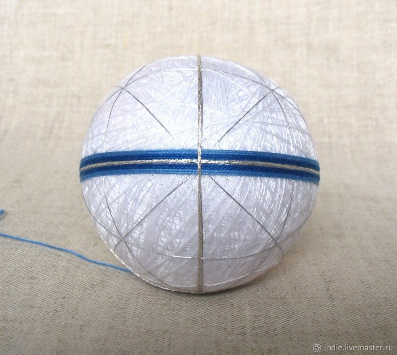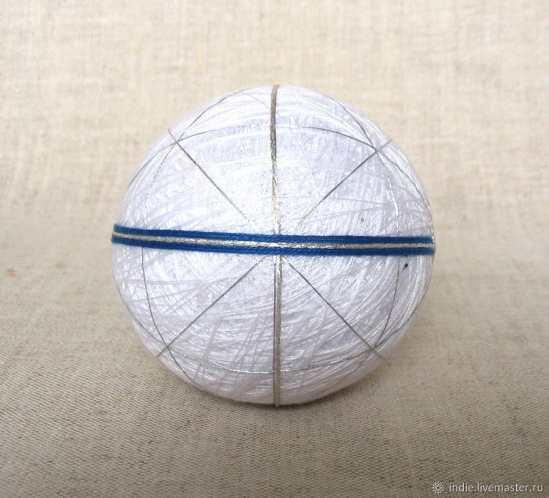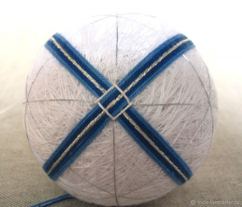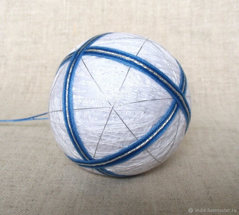 Это очень простой и приятный этап работы. Для начала, берем металлизированные нити (желательно мулине) и обматываем наш шар по двум меридианам и экватору. В каждом витке лучше закреплять нить только в одном месте. Так как пояса обмотки будут пересекаться, нужно учесть, чтобы все места закрепления нити и перехлесты оказались в нижнем слое. Это можно рассчитать, глядя на фотографию готового темари. Каждый пояс при пересечении с другим должен поочередно быть то сверху, то снизу.