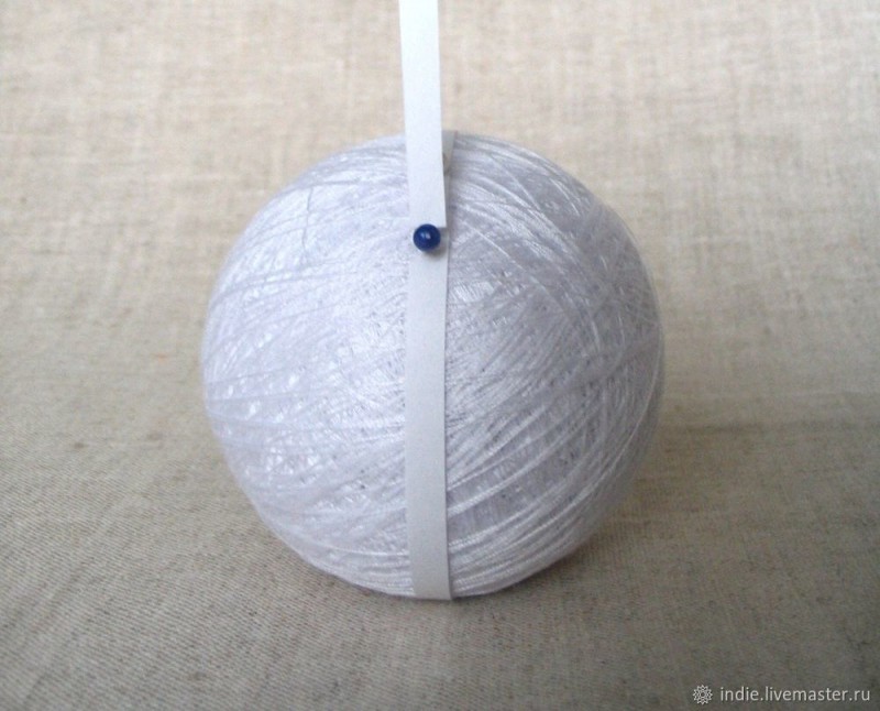 Когда размер шара достигнет примерно 7 см, берем нити основы и так же равномерно наматываем их на него.