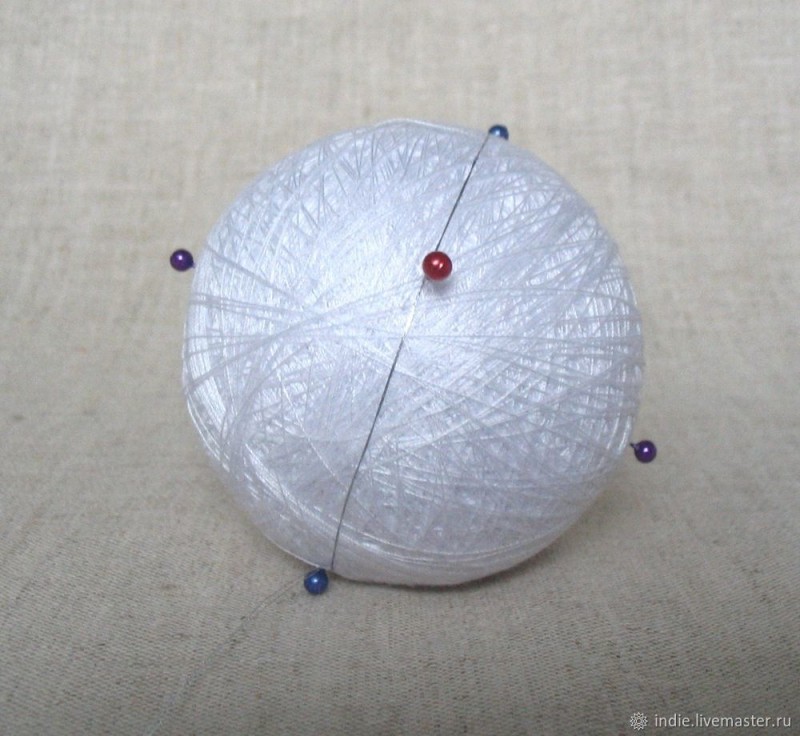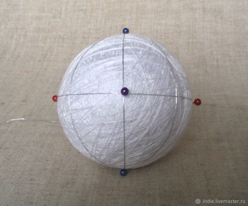 Обматываем шар по двум меридианам, закрепляя нить на полюсах. Зрительно делим каждый сектор пополам и обматываем шар еще по двум меридианам. Булавки из полюсов можно вынуть.