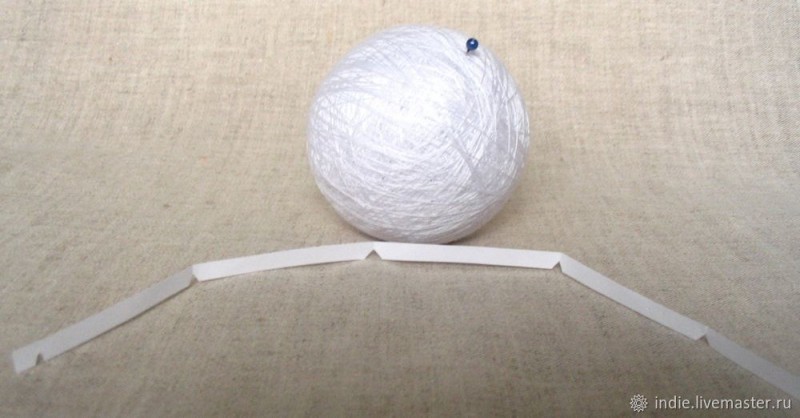 Втыкаем в шар булавку. Берем полоску бумаги шириной примерно 0,5 см, на одном из ее концов вырезаем небольшой треугольник. Этим уголком зацепляем булавку и обматываем шар полоской бумаги строго по центру. Там, где полоска вновь встретится с булавкой, делаем сгиб.