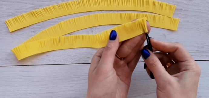 Для удобства складываем полосу фоамирана вдвое, фиксируем при помощи обычного зажима для волос, и только после этого начинаем нарезать. Разрезы делаем по длине всей ленты с отступом от верхнего края в 0,5 см. Аналогично поступаем с зеленой полоской. Захватив край желтой заготовки пинцетом, постепенно промазываем клеем не разрезанный фрагмент и одновременно скручиваем основу будущего одуванчика. По окончании одной полосы, не делая промежутка, переходим к накрутке следующей.
