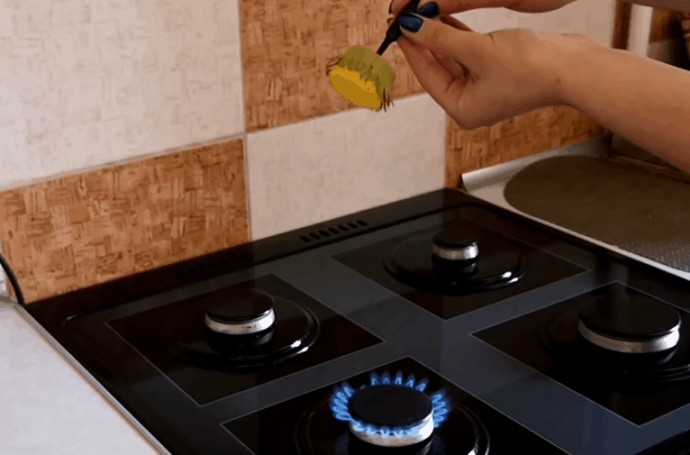 Окончив намотку желтого фоамирана, прокладываем зеленую полосу. Сделав полный круг, обрезаем излишки, проклеиваем бок и даем клею подсохнуть. Включив газ, проводим тепловую обработку, в результате которой заготовка постепенно станет превращаться в одуванчик. Держим цветок на расстоянии 30 см от конфорки лицом вниз. От нагрева фоамиран начнет расходиться.