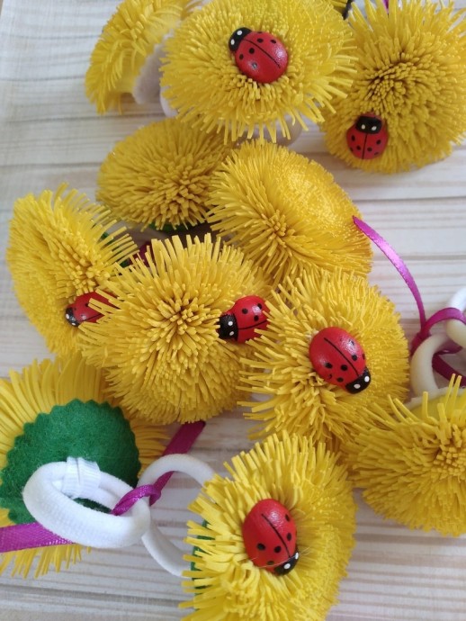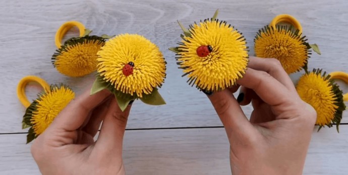 Наш одуванчик выглядит реалистично и имеет натуральную величину. О том, что форма листьев далека от настоящей, никто не догадается. Переворачиваем одуванчик и дополняем его резинкой для волос. Последний штрих — посаженная на одуванчик божья коровка.