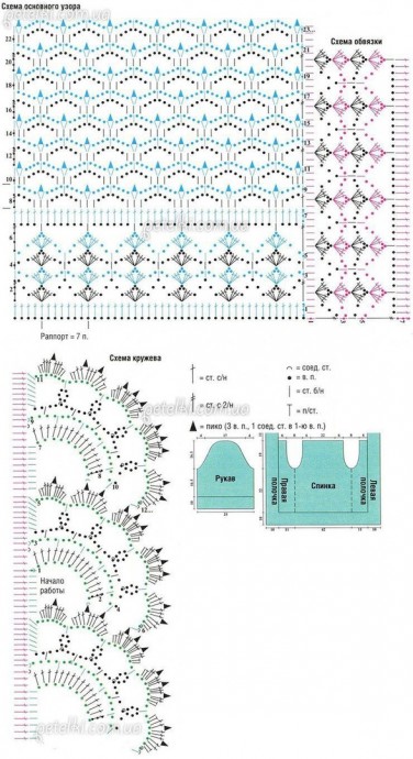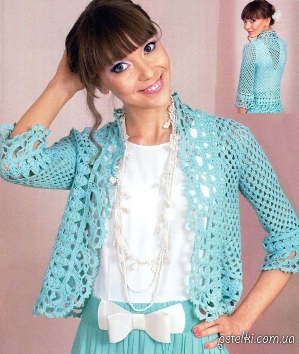 Ажурный узор крючкомКофточка “Бирюза” крючком. Ниточки слонимская пряжа в 4 сложения, 425 м в 100 гр, крючком 3,5, расход 250 гр, крючок.