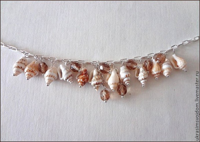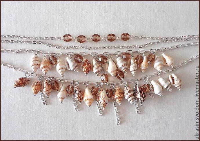 5. На нижнюю цепочку дополнительно добавляем украшалочки: кусочки цепочки с мелкими звеньями прикрепила на петельку пинов ракушек или бусин. Дополнительно добавила цепочку с мелкими звеньями без каких-либо украшений.