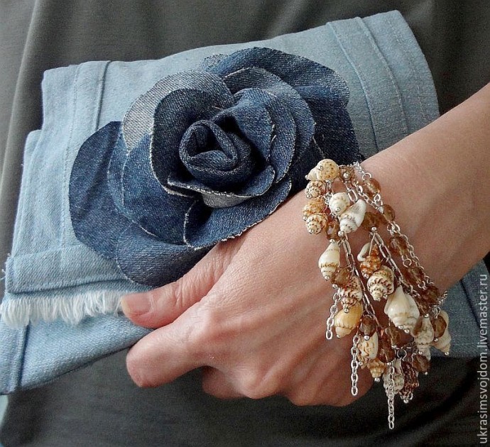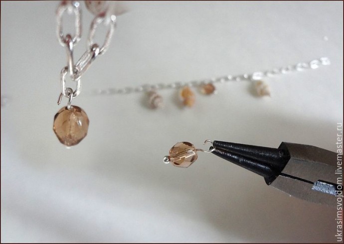2. Чтобы прикрепить деталь к цепочке, отгибаем петельку в сторону, вставляем в звено цепочки и опять закрываем. От цепочки с крупными звеньями с помощью кусачек (у меня кусачки встроены в круглогубцы) отщипываем два отрезка. Длину прикидываем так, чтобы браслет слегка свисал на тыльную сторону кисти. Сначала прикреплялись ракушки, потом бусины. Ракушки я прикрепляла через звено, а бусины в одно звено с ракушкой.