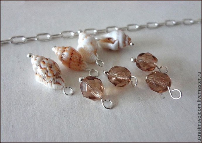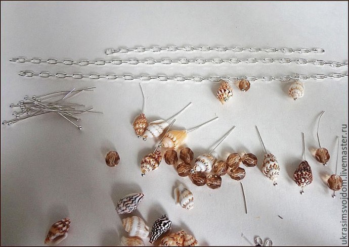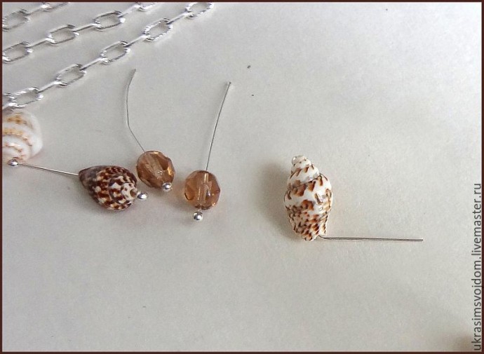 1. Пины (штифты) продеть в ракушки и бусины (5 бусин пока оставить). Пин отогнуть под прямым углом, укоротить до 1 см и с помощью круглогубцев кончик скрутить в петельку.