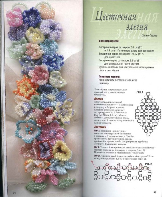 Выведите нить через ближайшую бисеринку 2,8 см -к одному краю манжеты. Нанижите 4 бисеринки 1,9 см. Протяните нить сквозь бисеринки цилиндра. Нанижите 4 бисерины 1,9 см. Пропустите нить сквозь группу из трех бисеринок, из которой выходит нить. Для закрепления пропустите нить опять через все бисеринки. Протаскивая нить через крестик, выведите ее в противоположном углу и присоедините вторую застежку (рис. 2).