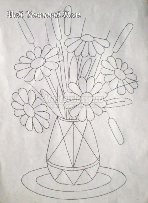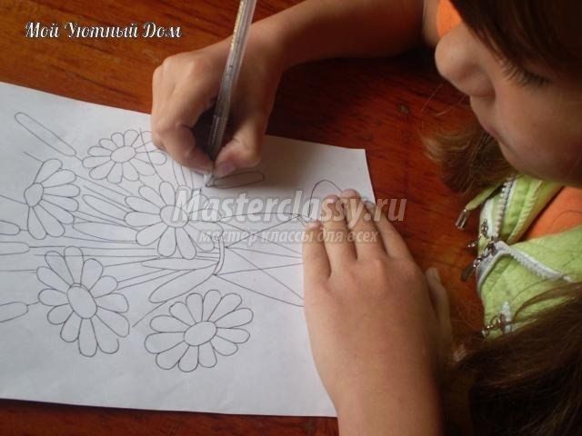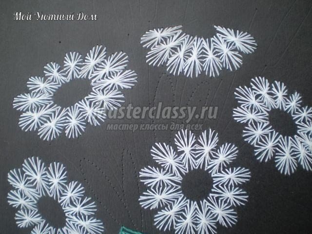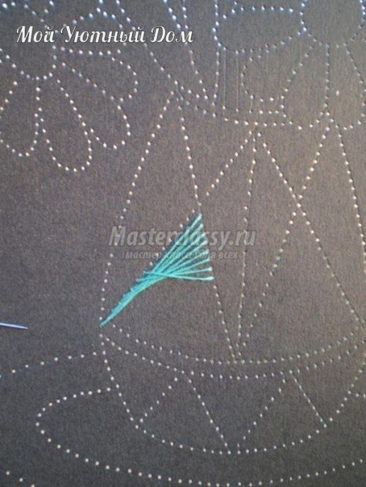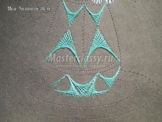 По линиям рисунка прокалываются отверстия, через равные расстояния друг от друга. Затем в дырочки протягиваются нити — их особое переплетение дает эффект объемности изображению.