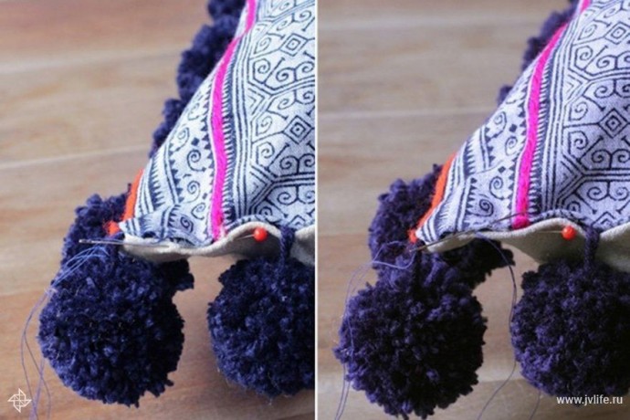 Подушка с помпонами выглядит намного более выигрышно по сравнению с обычной подушкой без них.