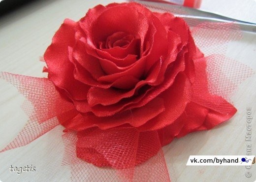 Роза из ленты: мастер-классЭта чудесная роза имеет подложку.И дополнительно украшена зелеными лентами, имитирующими листья.