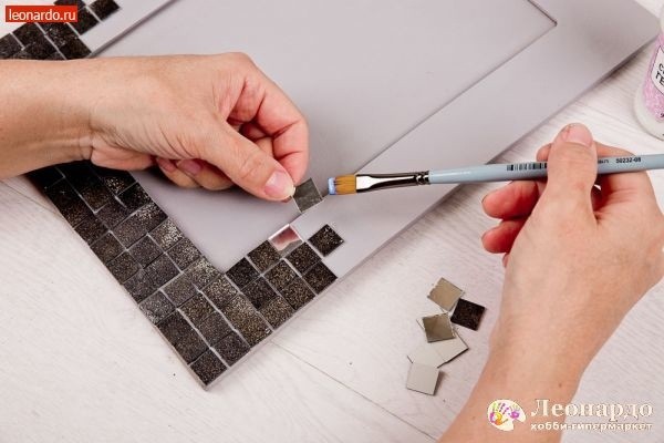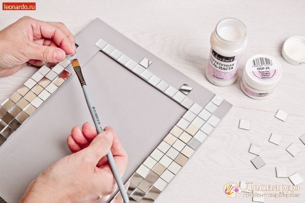 Зеркальные декоративные элементы стали сейчас особенно популярны. Довольно часто их используют в качестве интерьерного украшения. Простая рамочка из папье-маше, зеркальная мозаика, акриловая краска и специальная гель-паста – и у вас готова основа для яркого постера или памятной фотографии, которую можно повесить на стену в гостиной.