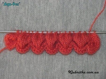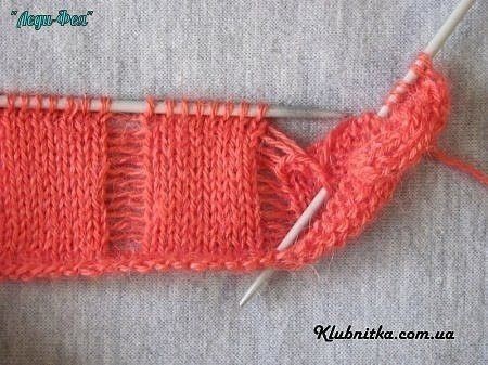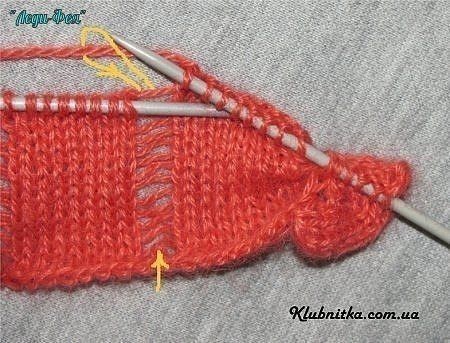 Сброшенные петли распустить до предпоследней петли начала вязаного ряда в лицевом ряду лицевые петли провязывать, а протяжки поднимать, вводя спицу во вторую петлю от края полотна, под протяжками захватить рабочую нить и вывязать лицевую петлю в изнаночном ряду вязать по 3 п. вместе изнаночной по-очереди все петли ряда, затем все петли провязанного ряда собрать на нить и закрепить