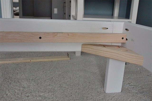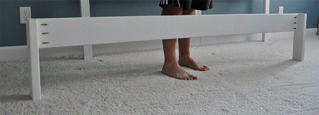 Последняя рекомендуется только для двуспальной кроватей (King size), хотя не помешает и для Queen size. Для полутораспальных кроватей (Twin size) потребности в дополнительной ножке нет. Центральный опорный брусок соединит середины передней и задней стенок рамы. Его нижняя грань должна находиться на одном уровне с дном рамы, при этом верхняя окажется на той же высоте, что и у опор для реечного дна. Крепление реечного дна кровати