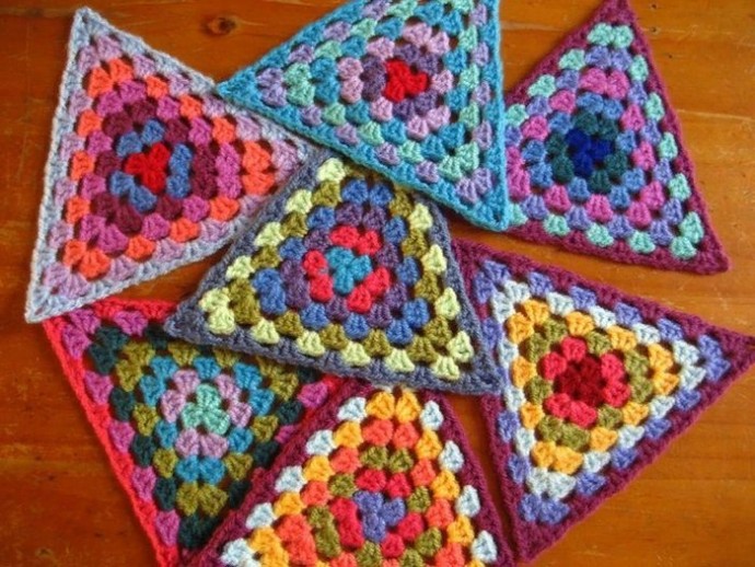 Цветные треугольники крючком могут быть как собраны в какие-то вещи, так и использоваться отдельно.