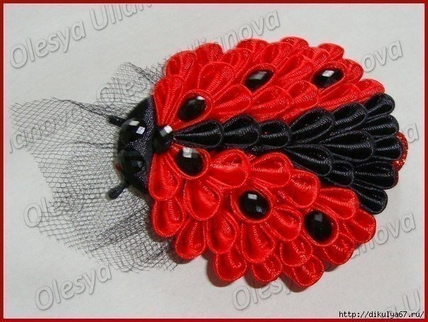 Божья коровка из лент может стать как брошкой, так и украшением интерьера.