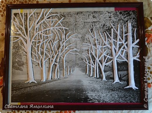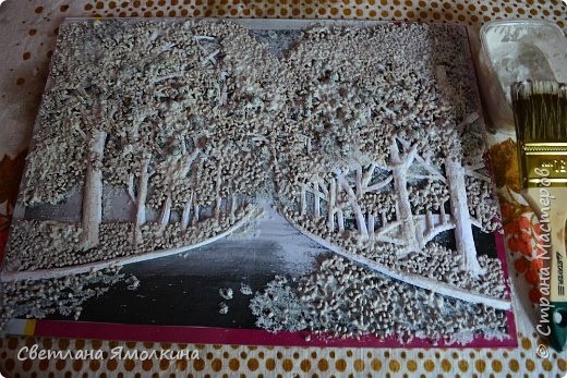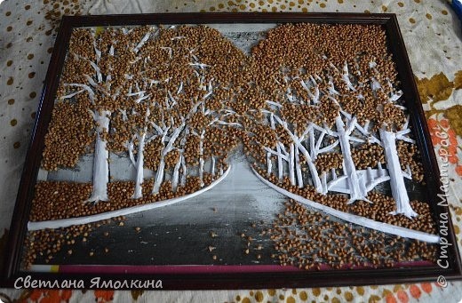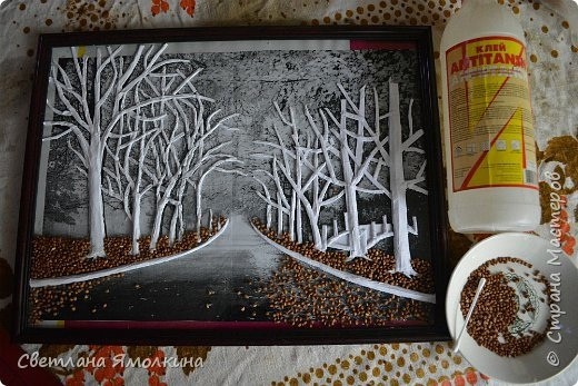 Для работы потребуется: фоторамка, распечатка картинки из интернета, бумага (для удобства взяла белую), клей ПВА и "Титан", акварельные краски, гуашь, лак, для покрытия, белый картон (для фона), крупа, ватные палочки, шпатлевка.