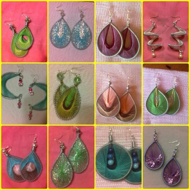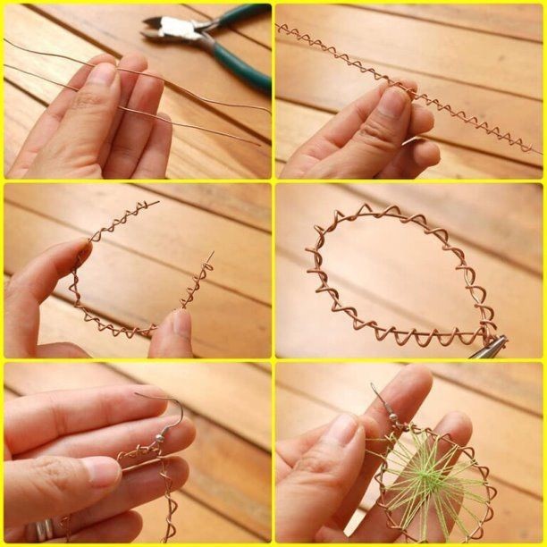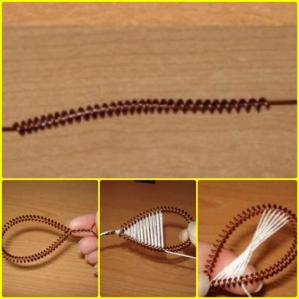 "Я обнаружила ее несколько лет назад, и после нескольких неудач мне удалось создать что-то приличное. Вот мк с фотографиями. В основном, требуется немного более жесткая железная проволока, которая составляет основу серег, и более податливая железная проволока, чтобы обернуть вокруг, как спираль. В этих спиралях проходят нити. У меня было много остатков проволоки, и я попробовала. Тут два мк: один с самой редкой спиралью и другой с самой плотной спиралью, которую я предпочитаю" - автор Надя Бартоли.